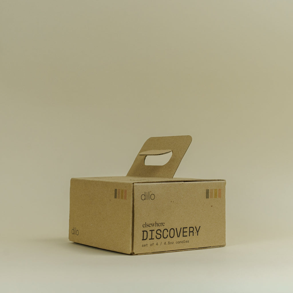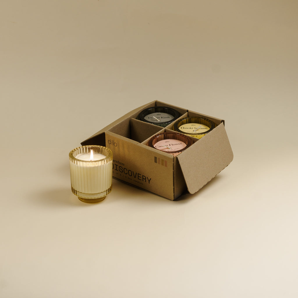 elsewhere CANDLE Discovery Set includes one of each Hinoki Sesame, Palo Santo, Desert Kush, and Cactus Flower - the same contents of the larger format elsewhere Candles, but instead in a color tone ribbed glass jar, perfect for decor as well as drinkware.
